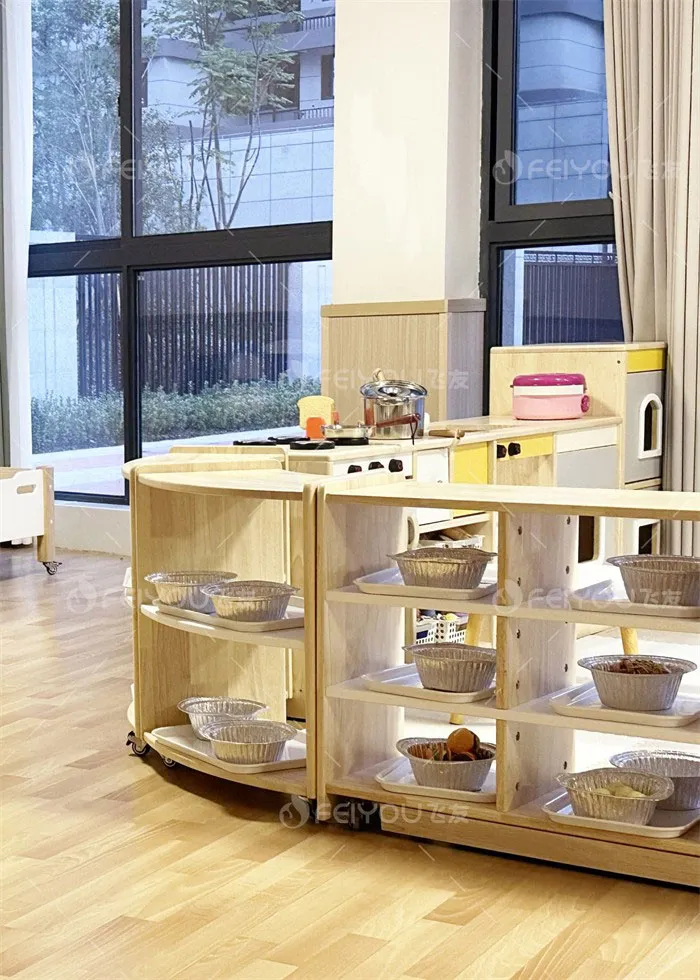 The living area allows young children to learn some simple and basic life skills, cultivate their hands-on ability, promote the development of hand muscle movements, make children dexterous and have hand-eye coordination, and form stable movements and behavioral habits.