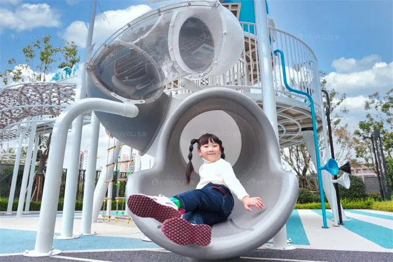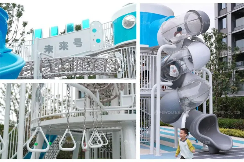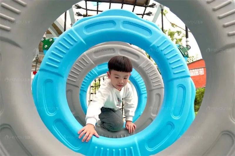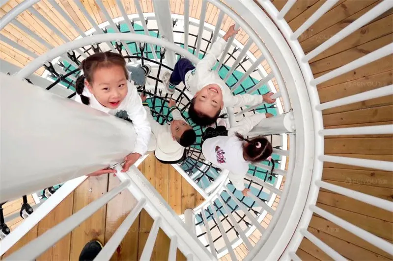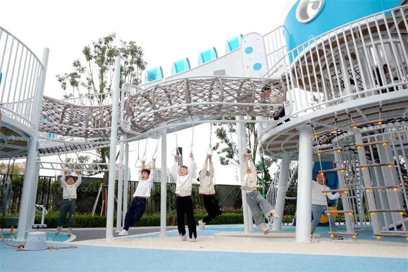The designers used the space under the corridor bridge to configure a variety of non-powered fun facilities such as rings, horizontal bars, and drilling hoops to meet the needs of climbing and exercising a sense of balance, cleverly improving the utilization of space.