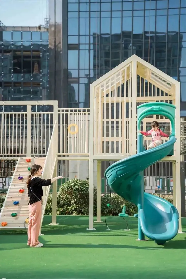 The combined slide connects the external space of the teaching building through the slide tube, seamlessly combining the indoor and outdoor learning environments.