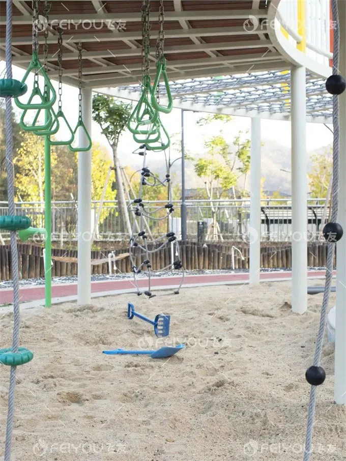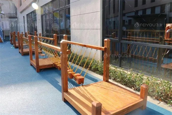 The physical fitness development equipment has various shapes and uses original wood as the main material. It integrates multiple functions such as jumping, climbing, drilling, sliding, and swinging. It is both safe and interesting.